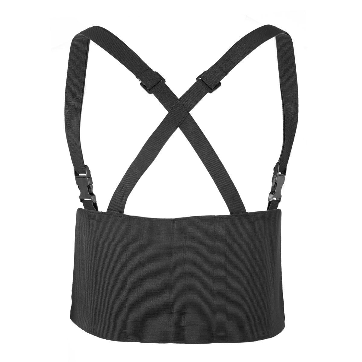 The Back Defender offers support with its breathable 8" Lycra spandex primary belt and knit elastic construction. Featuring a comfortable high-rise panel design, four Nylon stays, 4" wide side pulls, Velcro closure, and 1 1/2" wide elastic suspenders for comprehensive back support.