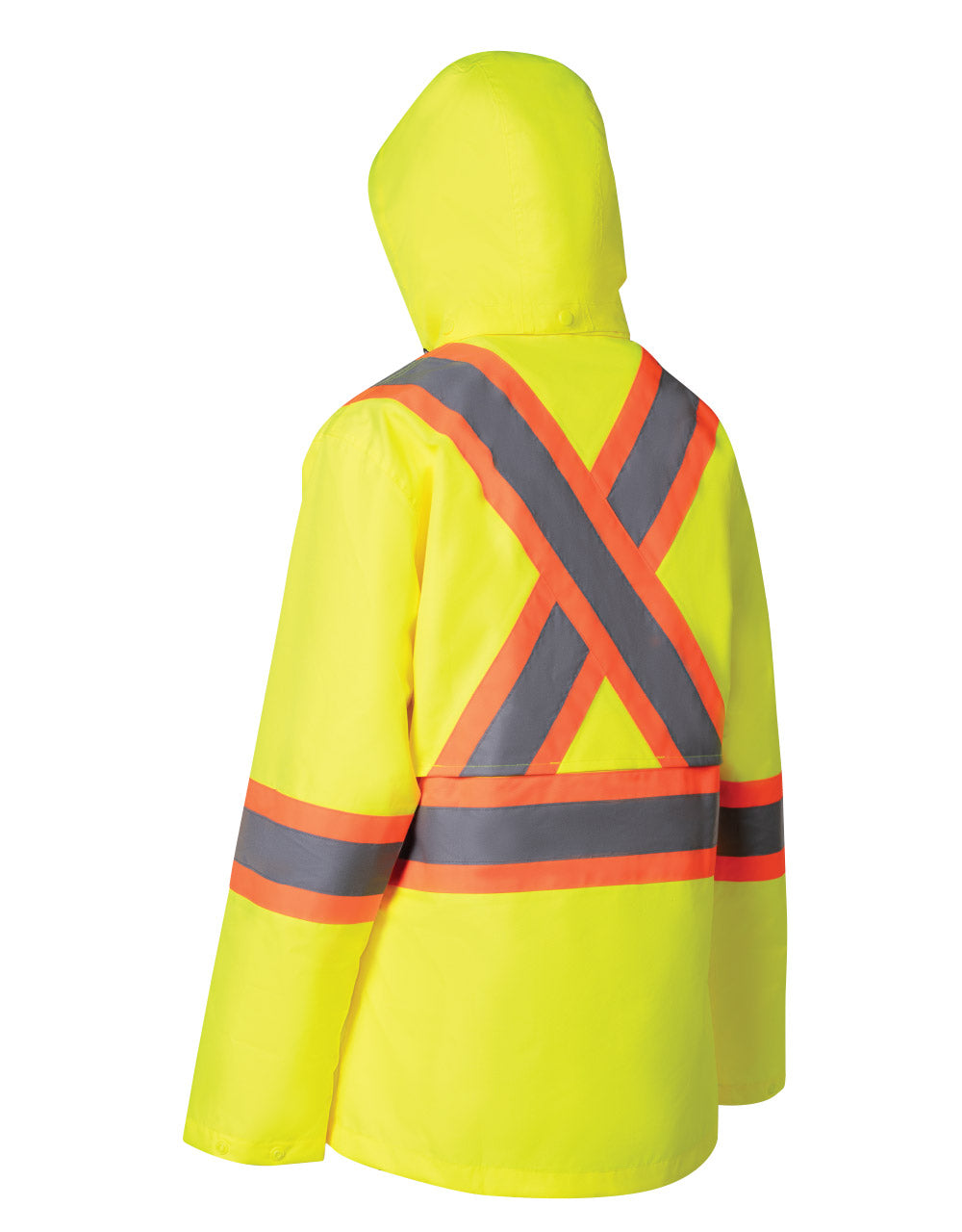 Stay visible and protected with our Women's Hi Vis Safety Rain Jacket. Crafted from 100% Polyester 300D Oxford fabric, it features a snap-off removable hood with a drawstring, a packable hood, and a stand-up collar for versatile wear. Fully lined with a radio clip and front zipper with button storm flap, it includes 2 front pockets with Velcro storm flaps. This water-resistant jacket, meeting CSA Z96-22 Class 2, Level 2 standards, becomes CSA Z96-22 Class 3, Level 2 compliant when worn with our rain pant (023-WHVRWPORT). With detachable snap-off hood and rib-knit storm cuffs, it's designed for all your safety needs.