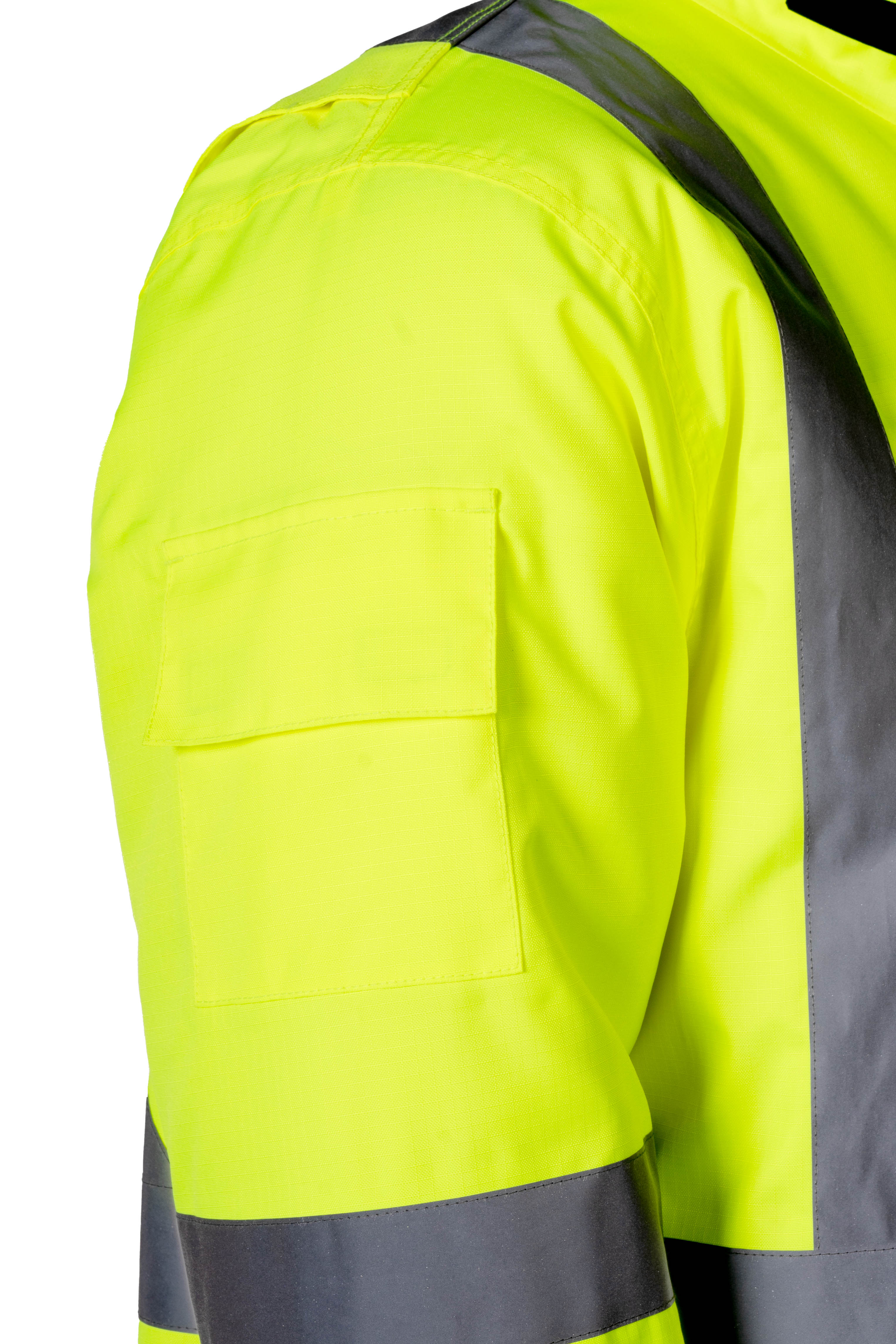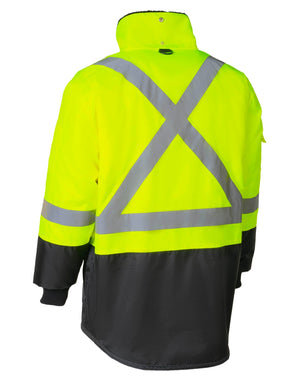 Experience the ultimate in cold-weather protection with the Fraser Freezer Jacket, named after the frigid Fraser, British Columbia. Engineered to withstand temperatures down to -47.9°C, this jacket features a high-cut, fully lined collar, and a snap-back option for adaptable comfort. Its Forcefield Zip Extensions allow easy access to gear with gloves on. Made from 100% 300D Oxford Poly Ripstop, it ensures durability and tear resistance. The jacket offers ample storage with multiple pockets, including a secured sleeve pocket for essential IDs and certificates. The customized glove sleeve enhances warmth in extreme cold, while the heavy-duty yet lightweight lining provides insulation without bulk. Ideal for cold storage, food service, transportation, and demanding environments, it fully complies with the latest CSA standard: CSA Z96-22; Lime meets Class 2 Level 2.