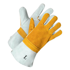 The "Gold Welders" gloves are premium grade split leather welding gloves, offering excellent heat protection and spark resistance. With split leather covering the palm, back, and cuff, they provide great value and durability.