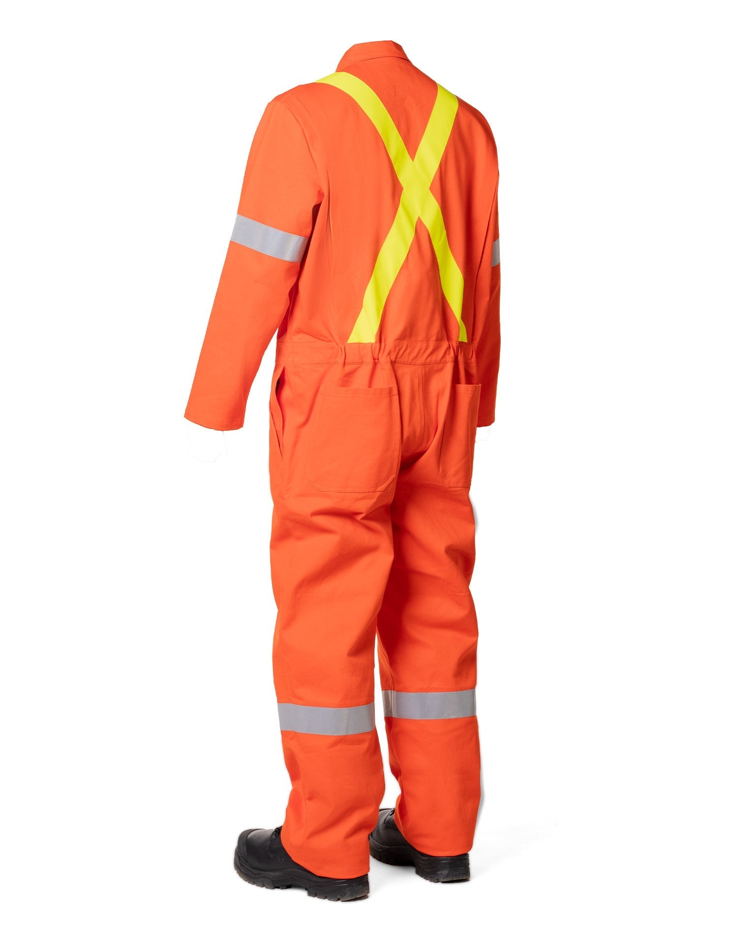 The Hi-Vis Safety Unlined Cotton Coverall is designed for durability and visibility. Crafted from 100% heavy-duty cotton, it features high luster silver reflective tape on sleeves and legs, 2" yellow retro-reflective tape on the front, and a yellow X on the back. Equipped with a heavy-duty metal zip, multiple pockets including waist, rear hip, and chest pockets for functionality.