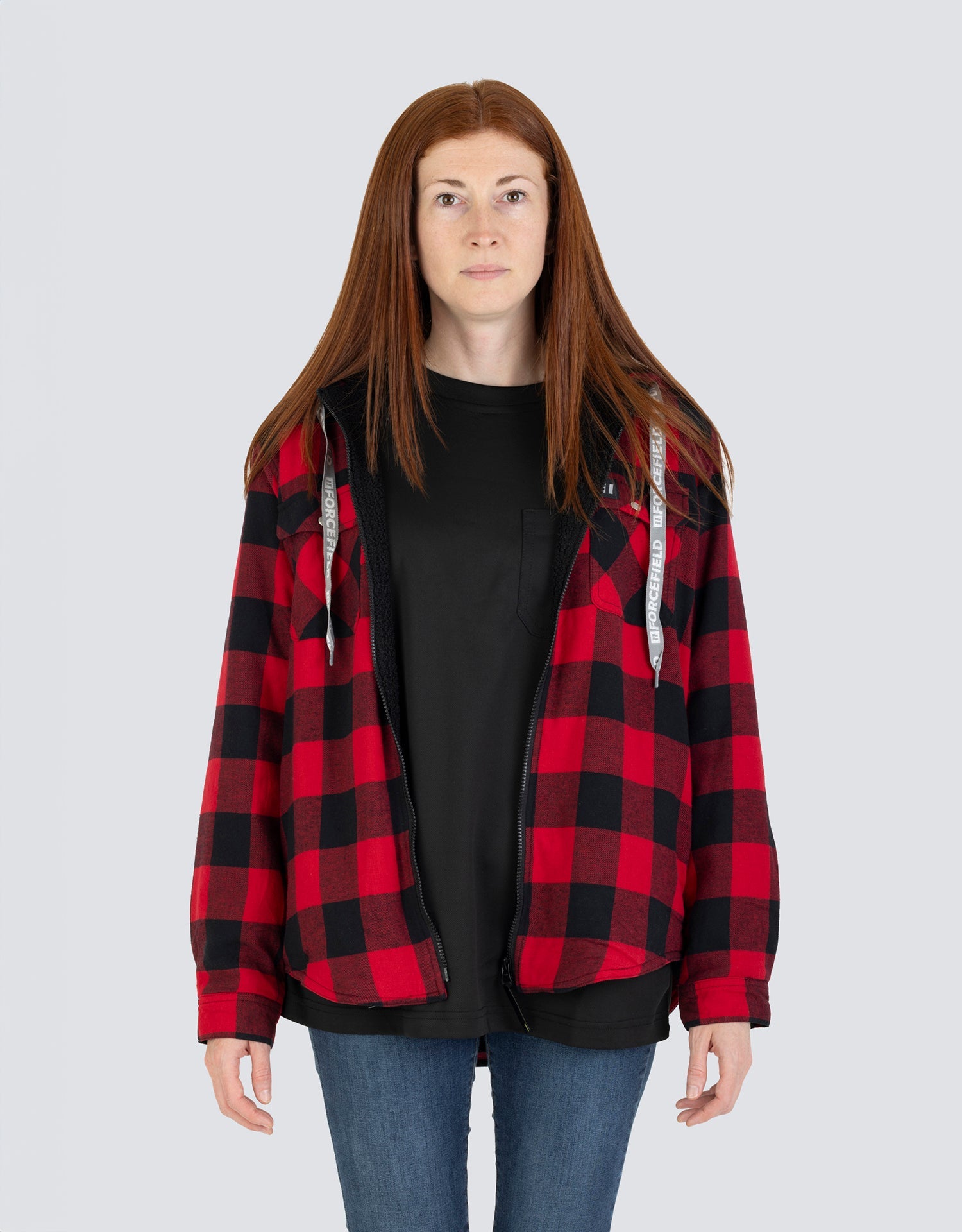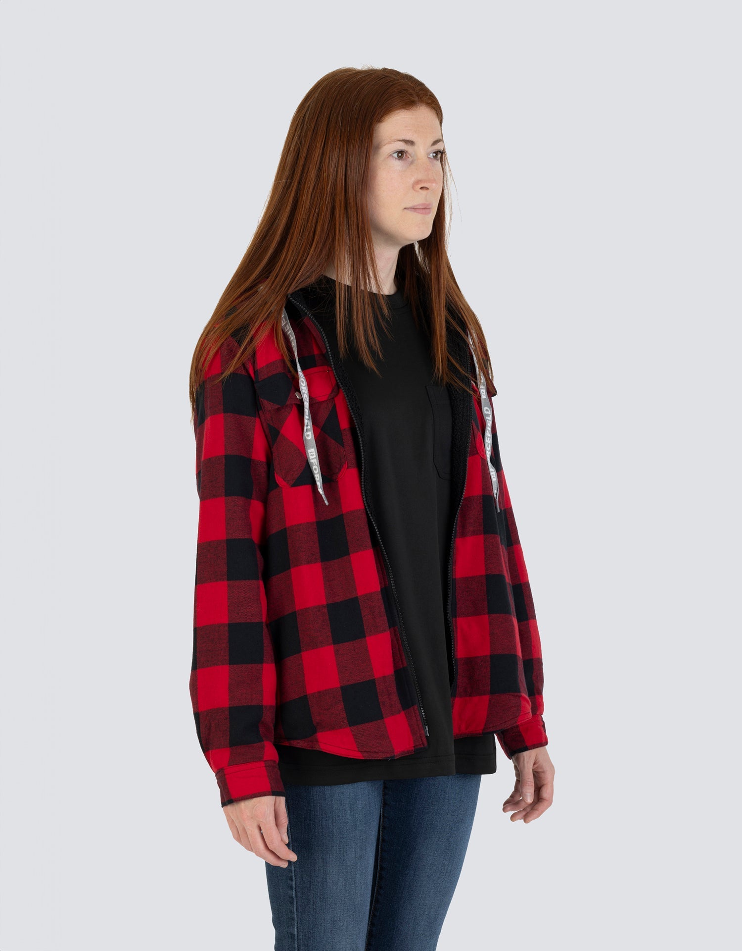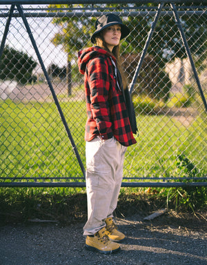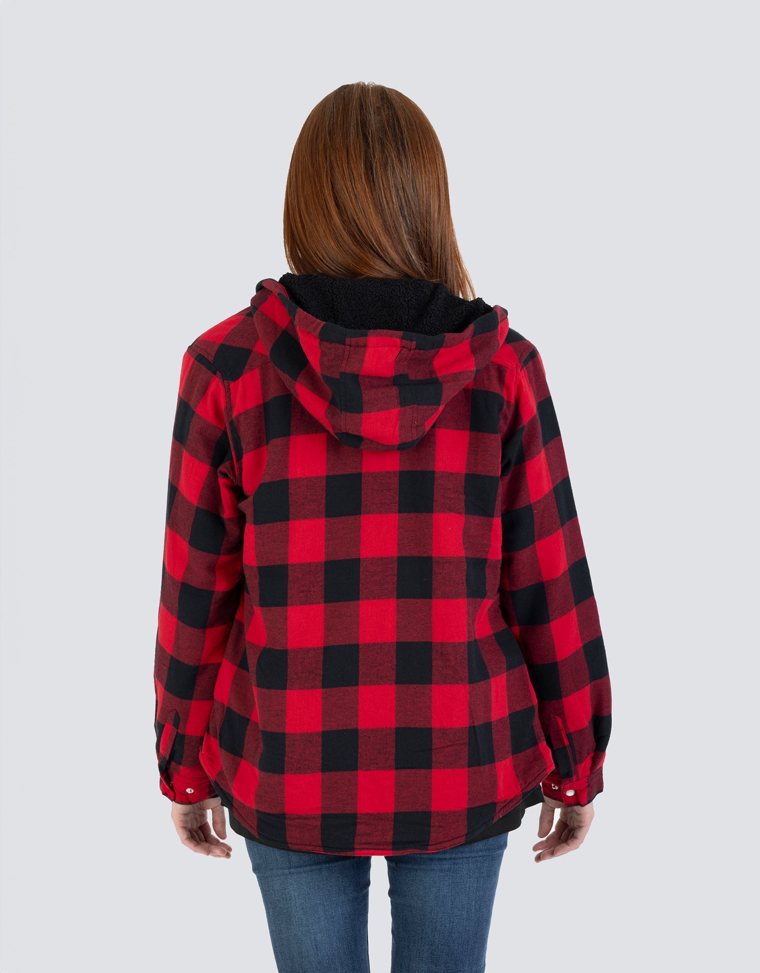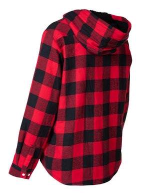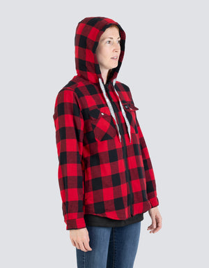 Embrace winter's charm with our Women's Hooded Sherpa-Lined Buffalo Plaid Flannel Shirt Jacket. Made from 100% cotton flannel in iconic buffalo plaid, this jacket guarantees warmth via its sherpa lining and polyester fill. Its unique double-layer design boosts longevity. Two chest pockets with snaps add a touch of utilitarian chic.